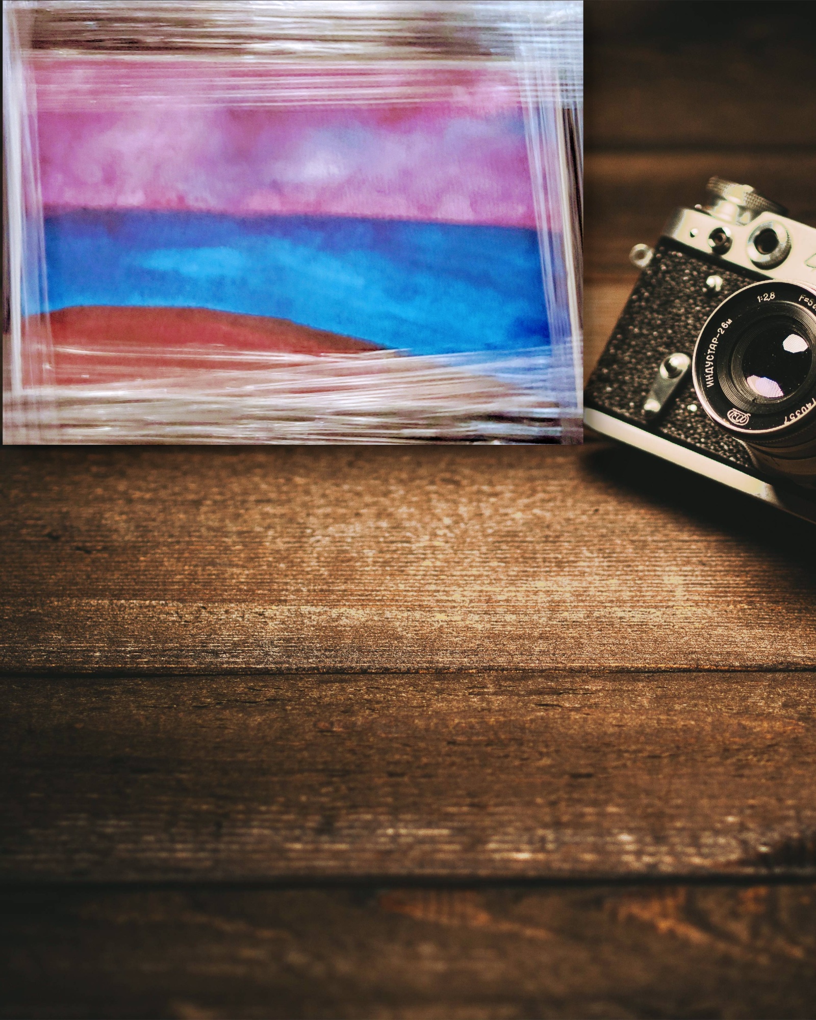 Obras más pequeñas. Figuras Abstractas Visión de futuros posibles. Y paisaje costero en atardecer.